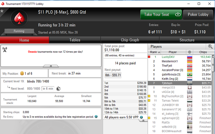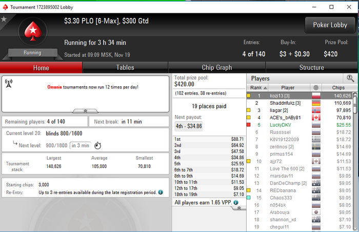 Далее в омахе шел как царь, топ1 держал почти весь турик, но раздачу за 140к стека, парню просрал 2 аута, ГГВП) это была предфиналка, далее поднял фишек, сели на финалку, ну и там фишары сожрали без шансов, мой трипс был перкуплен по риверу старшим трипсом, далее мои две пары убились об гатшот, вот такой резалт)