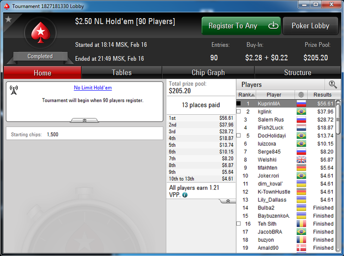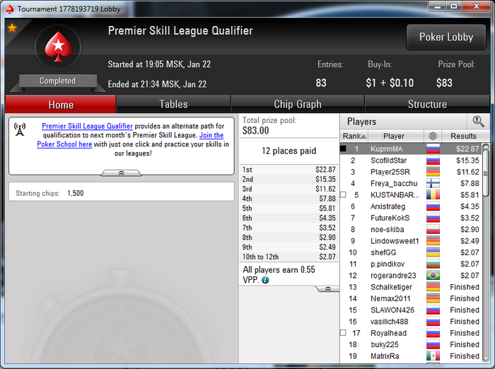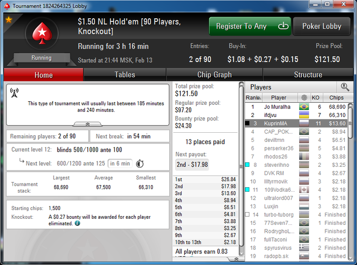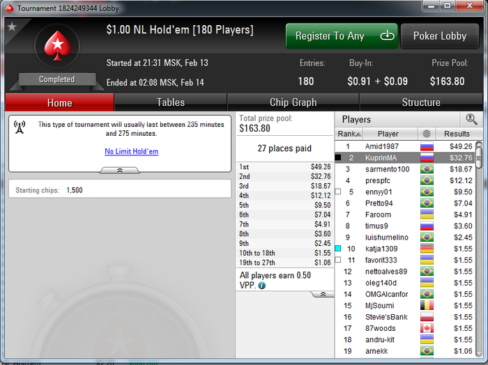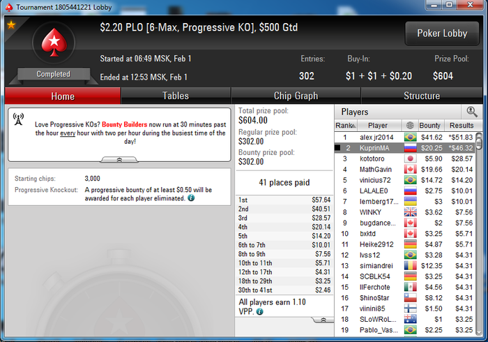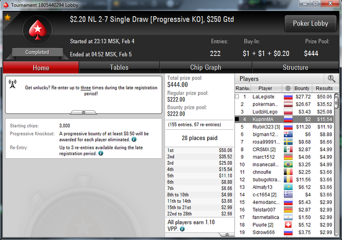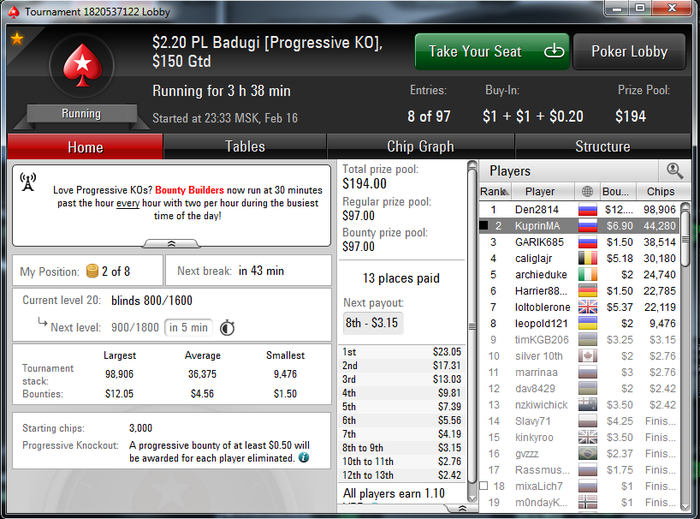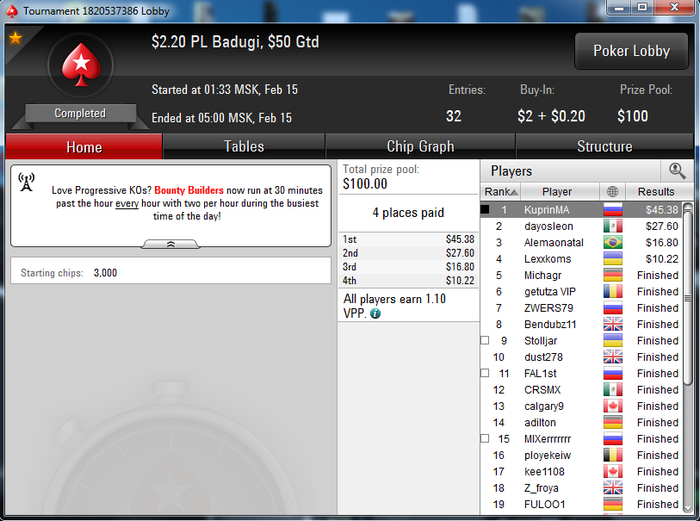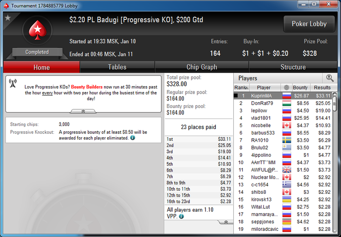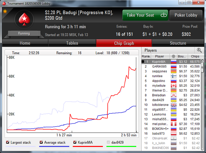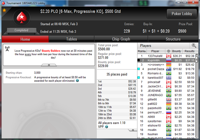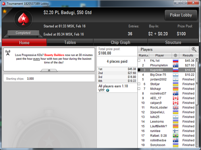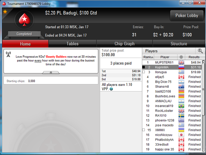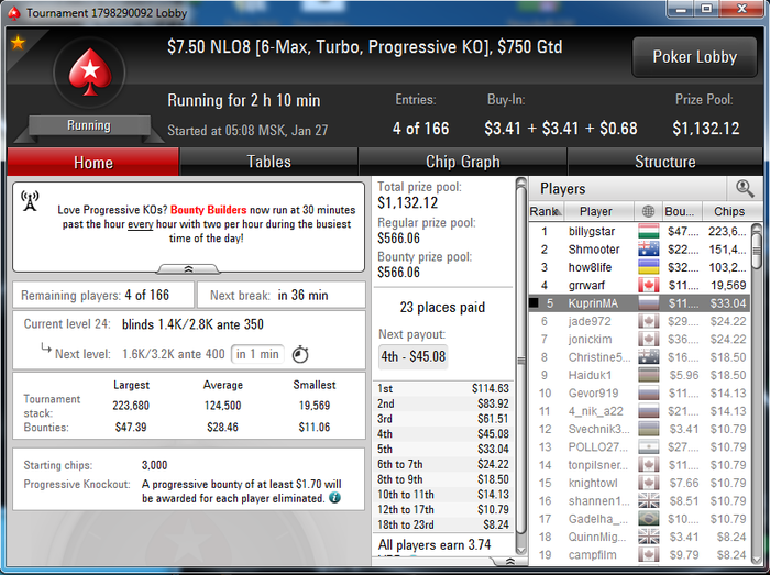 С банкроллом всё как и раньше. Слишком часто делаю кэшауты, и если раньше имея БР к примеру 700$ я мог в один момент вывести 500$, то в январе этого года я довыводился до такой степени, что у меня в кассе на старзах осталось 34$. С таким бр-ом я не оставался ещё никогда и это сильно давило на меня психологически, когда я садился играть, но мне снова удалось раскрутиться, причём достаточно быстро. Сначала пришлось почти неделю поиграть снг в нлх 0,25$ 45-90-max, а затем 5 подряд финалок в бадуги, после ещё 2 финалки в омаху и в итоге за январь вышло +500$, из которых 300 уже снова выведены. Я рад что мне удалось в очередной раз раскрутиться, в этот раз совсем с мелочи. Это добавляет мне уверенности, но при всём моём желании подняться по лимитам, постоянные кэшауты сделать этого не позволяют, но как быть в таком случае, не имея дополнительных источников дохода, я пока не представляю. Игру от беккера пока не рассматриваю.