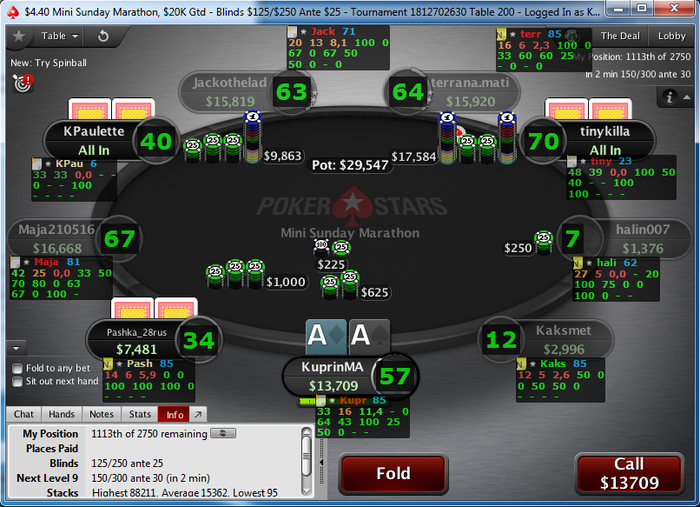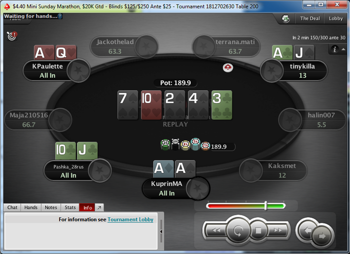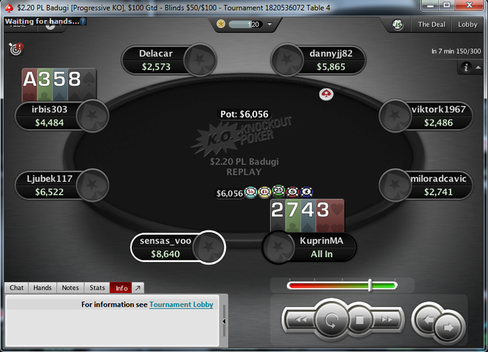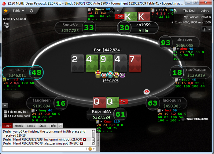 В этот раз пришлось вывести почти весь бр на лечение своей кошки. Как-то вечером стала мяукать и искать место как обычно бывает когда собирается рожать. Я в непонятках в чём дело, вроде не гуляла, утром к ветеринару. Там нашли какую-то болячку и понеслось. Сказали делать операцию, но никаких шансов что выйдет из наркоза не давали, к тому же кошка уже взрослая. И вот мне дают бумагу подписывать что я согласен. Тяжело в такие моменты, но ничего не остаётся. Не делать операцию точно нельзя. В итоге сделали операцию. Когда вынесли её и положили в специальную переноску для кошек, ветеринар подошла чтобы сделать какие-то уколы, а она с бешенными глазами начала так брыкать лапами, что переноска развалилась на две части. Я сразу подумал что это нехорошо, и что сразу после операции опасно так прыгать. После этого дней 10 подряд носил её на капельницы и уколы, плюс дома ещё делали сами. Ещё через пару дней у неё на животе на месте шва появилась огромная шишка, которая по всей видимости все эти дни росла под попонкой. По размерам она была в 2 раза больше куриного яйца. И вот прийдя в очередной раз в клинику, врачи посмотрели и сказали что нужно делать ещё одну операцию, а учитывая что кошка взрослая, что она с трудом вышла с первого наркоза и сейчас нужно делать ещё один, спустя всего примерно 10 дней, шансы были ещё меньшими, но снова ничего не оставалось как соглашаться. Помню как она первое время громко и страшно мяукала из операционной. Делали операцию долго, и честно я уже думал о худшем, но врачи вышли и сказали что всё сделали, можете забирать. Дальше было то, что после этого второго наркоза дома кошка была просто никакая, а ближе к вечеру я понял, что она умирает. В один момент я стал её шевелить, переворачивать с одного бока на другой, а она уже с открытыми глазами не подавала никаких признаков жизни. Я встал и понял что всё... Взялся за голову и пошёл в другую комнату. Кто любит животных и прожил с ними 15 лет, тот меня поймёт. Мне ничего не оставалось как уповать на Бога, а когда я снова вернулся к ней, увидел что она вроде еле-еле дышит. Я опомнился и стал быстро звонить в ветеринарную. Был уже поздний вечер и врачи сказали что принести я её уже не успею, да и я подумал смысл нести, если она не выдержит дороги. Кое как залил ей со шприца в рот воды. Признаков жизни кроме небольшого дыхания она не подавала. Я пол ночи просидел с ней, но думал до утра она не дотянет. Я до сих пор не понимаю как она выжила когда я был уверен что она уже была умерла. Была ли это клиническая смерть и что ей помогло. Может глоток воды, а может Бог помог, но я уже месяц чуть ли не каждый день это повторяю. Слава Богу чудо свершилось и мой котэ сейчас лежит и мешает мне печатать этот текст. Она всегда лежит на столе, когда я катаю Сейчас было бы хорошо выложить пару красивых скринов с заносами, но как уже писал выше, я почти перестал играть холдем, и а в лимитках заносы не такие большие, но зато стабильные. Выложу парочку из свежих, что нашёл, есть и более значимые доезды за прошлый год, но лень искать. Посмотрел только картинки, я угадал? Всем удачи, встретимся за столами!