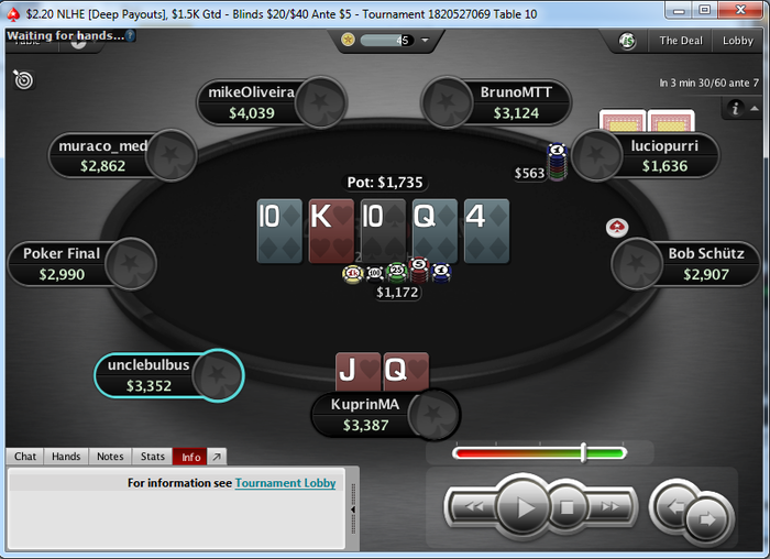 Начало турнира. Оппонент с кат-оффа делает рейз 2,5 бб. Я с МБ доставляю с QJs. Далее играю чек-колл флоп-тёрн с неплохим комбо-дро. До ривера ничего необычного, стандартная игра, но именно эту раздачу я не просто так выбрал для примера. Здесь я хочу обратить ваше внимание на ход моих мыслей на ривере. Оппонент ставит третий баррель (14 бб) и я начинаю анализировать ход раздачи. Начнём с префлопа. Позиция поздняя, блефовая. Флоп спаренный, но всё равно в диапазоне соперника много Королей. Я коллирую по той причине, что у меня стрит-дро и дальний флеш. Здесь важно понимать, что тёрном на подобных флопах мы можем усилиться до комбо-дро по многим картам. Черва даст нам дополнительно ещё и флеш-дро, дама или валет так же нас немного усилят. И так, до ривера я дошёл чек-коллом, моё стрит-дро не закрылось, но осталась пара дам. В этом случае моя рука является по сути блеф-кэтчером (т.е. рукой, которая в этом случае бьёт только блефы). Начинаем анализировать. Предположим, что у соперника Король. Стал бы он ставить три ставки по такой доске? Если мы предполагаем что наш соперник адекватный, то конечно нет. На этой структуре борда лежат и стриты, и флеши, и фулл-хаусы. Ставить 3 ставки просто с парой Королей здесь конечно адекватный игрок не будет. Даже если бы у соперника были здесь АК, по такой доске на ривере он бы сыграл чек-бихайнд. Если предположить что у него стрит, AJ/J9, то ривером закрылся флеш, и учитывая что борд спаренный, то даже со стритом добирать здесь будут не всегда, хотя я бы со стритом играл тут бет-пас. Так же стоит обратить внимание на немаловажный факт, - у меня в руке валет, а значит я блокирую значительную часть стритов. Получается, Король ставить здесь не будет. Трипс десяток то же врятли будет добирать по такой доске. Отсюда следует то, что велика вероятность того, что соперник блефует. Здесь говоря по-покерному, диапазон соперника полярный. То есть у него будет или очень сильная рука (в этом случае фулл-хаус), или блеф. Средней силы руки здесь практически никогда не будет. Исходя из всего вышеизложенного я сделал колл. Какая рука была у соперника смотрите по ссылке. https://www.boomplayer.com/22765851_920BBB205E