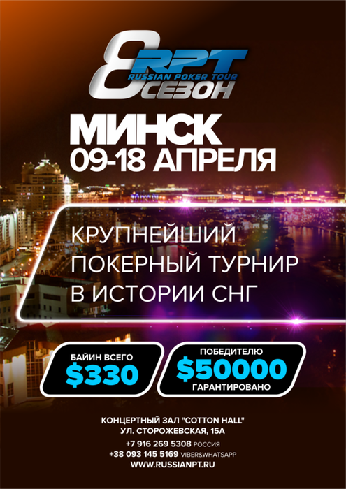Как вы уже знаете 8-й сезон RPT продолжается, и эта – весенняя его серия пройдет в любимом подавляющим большинством наших гостей Минске, а генеральным партнером Russian Poker Tour выступит 888Poker! Заметили, сколько восьмерок в предыдущем предложении, как и на серии в целом? Должно быть это на фарт!