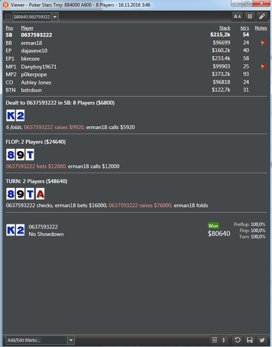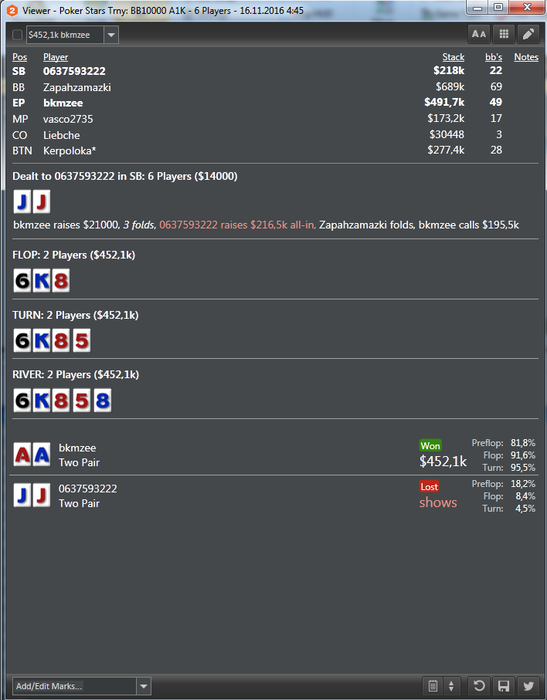 тут играл против фиша, можно было и сыграть чек флопа и терн и ривер поставить по 50% но я, выбрал такую стратегию, хотел терн сыграть чек и на его ставку олл-ин поставить но он опередил меня и я, уже не мог колирывать