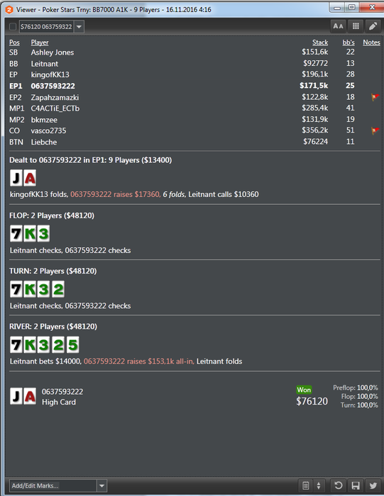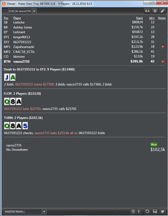 Тут средний опп на бб по флопу ставлю с-бет так как фд 1 овер карта+ стек у него на мой с-бет олл-ин не позволяет поставить, тёрн сыграл чек олл-ин так как тузов у опп не будет по такому экшину так как он их уводит в ре-стилы