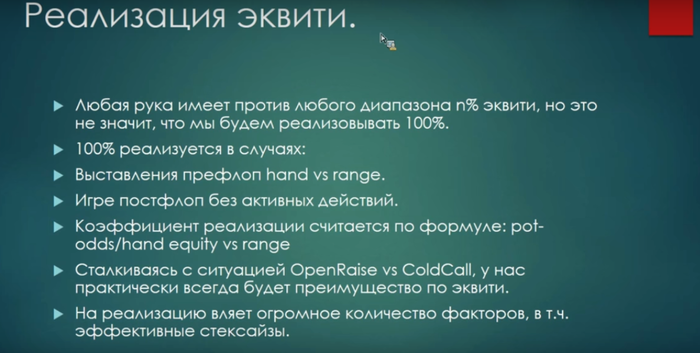 Подведу итоги: когда вы будете рейзить на префлопе, порой у вас будет возможность прочекать в ответ на флопе. Порой, по разным причинам, вам захочется сделать ставку на тёрне вместо ставки на флопе. Поэтому вы можете захотеть отложить конт-бет, для того чтобы максимизировать ваше эквити.
