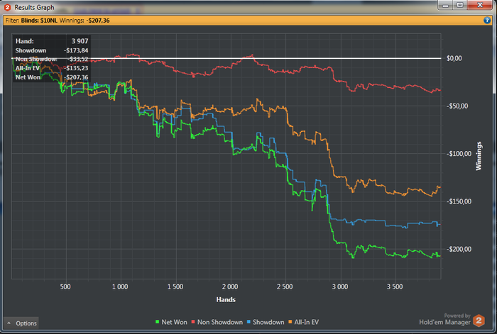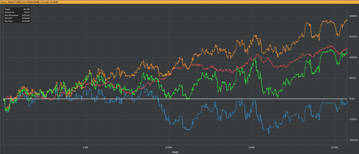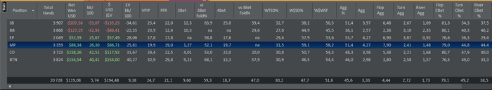 Все никак руки не дойдут до нормального анализа базы, но по тем статам, что я выкладывал, есть подозрение, что дело в слишком частом пуше на 4бет с СБ против ББ или БТН. А еще похоже слишком часто ставил цбет в никуда на сб, потому что последние 1000 рук перестал это делать, и график перестал падать. Ужасные WTSD и W$SD на СБ