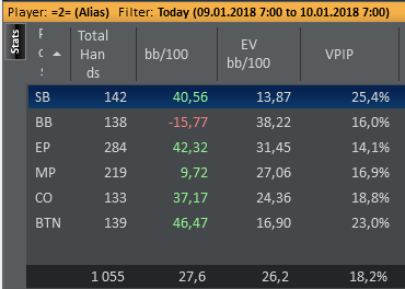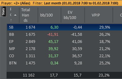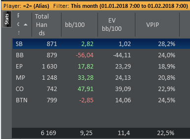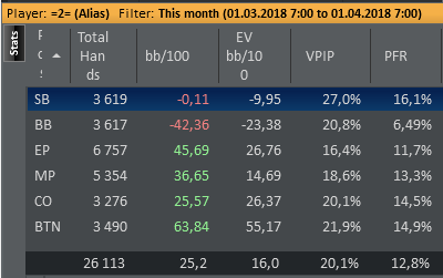 nakazator95 @ 9.3.2018 статы по позициям рук мало но на ББ заливаешь. А вот не доигрываешь на поздних позициях)