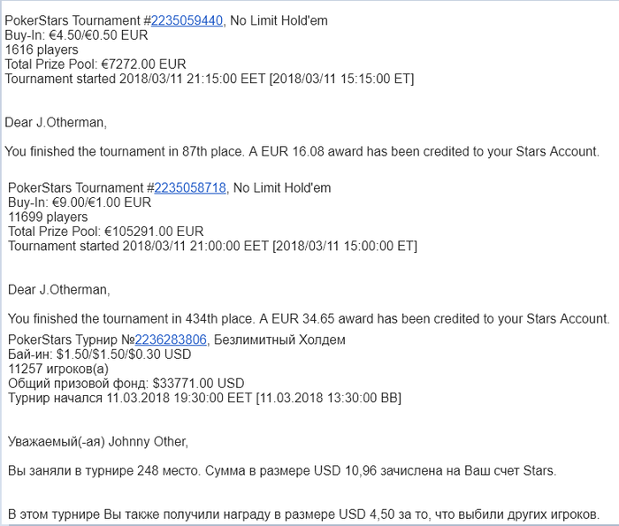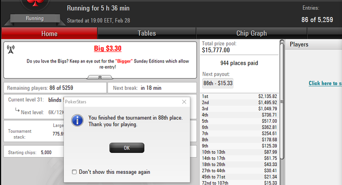 Зато появился приятный кеш на покерстарс испания. Микродоезд Обидный вылет КК в АК Пытался отобраться на миллионик Очередной обидный вылет на пати QQ < AQ Недоезд на Винамаксе 16бб ТТ не устояли против Т9 :) И заключительный аккорд вылет в биге за 3