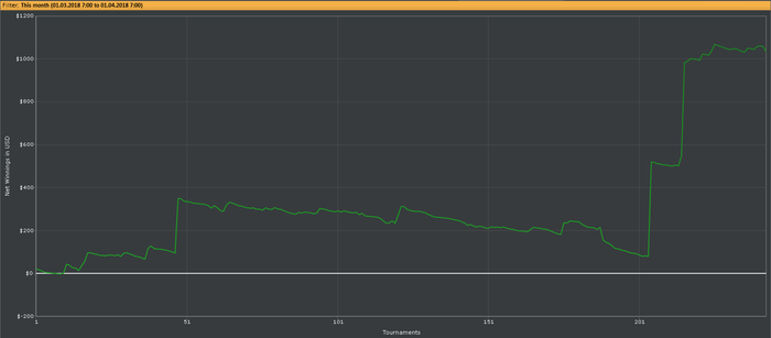 Много поездок (командировки), ситуация повтор прошлого года. Я не могу бросить (пока работу), поскольку несмотря на все - это пока стабильный источник дохода выше среднего уровня, соответственно я не могу играть полноценные сессии, приходя после забега по объектам.. Хотя, как показали 7К рук в зуме НЛ10, можно зарабатывать около 4у.е./час, что около 32 в день и около 700 в месяц, как минимумум! Добавляю спины (за февраль около 4000 гривен ~150$) и кэш - которых немного