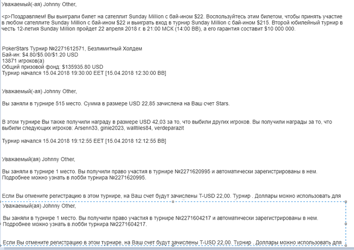 Забегая наперед, скажу, что билеты использовал в воскресниках. Первый блин комом - однозначно. В ПКО вылетел без шансов, просто не заходило и уровень 3-бетов/4-бетов порвал мою уверенность в своих силах. А вот в стандартном турике обидно на 30ББ с КК по доске 26В "попал" в АА.