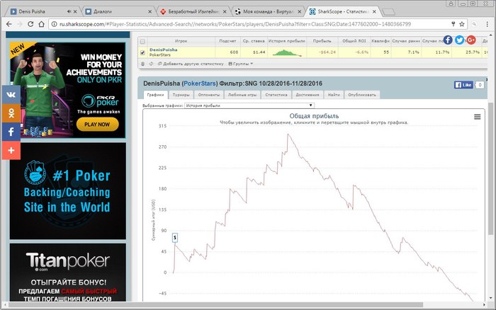 Привет всем, долго тут не писал ничего, был занят своими делами, катал не так уж и много, отдыхал занимался здоровьем и т.д. Ранее говорил о том что хочу откататьс 28 октября по 28 ноября - 750 турниров, после 5-6 сессий был уверен в том, что откатаю 1К турниров, но потом катал всё меньше и меньше. По профиту тоже с +250 в первые 5-6 сессий, упал в минус небольшой. Сделав анализ, увидел что лучше идут турниры 90МАХ. Ниже предоставлю графики. Всем фарта График