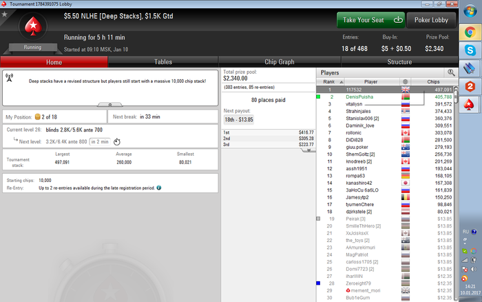 Всем привет! Всех с новым 2017 :) Надеюсь этот год будет очень плодотворным и куда лучше чем прошлый. Есть позитивные моменты, уже некоторое время я перешёл полностью в МТТ, познакомился с хорошим тренером и человеком, небольшие плоды уже есть спустя пару тренировок, последняя сессия перед новым годом, могла сложиться очень хорошо, но всё же не доехал, 8 аут в Дипе по 4 евро на IPokere. Планы на ближайшее время, работать много в плане игры и катать-катать и ещё раз катать. Так же хочу скорее восстановить свою травмированную ногу и начать бегать, далее вернуться в футбол, ну а сейчас самое время уже начинать приводить своё тело в порядок, потому что это ужас.(3 месяца без движения, да и покушать люблю), в общем хочу как можно быстрее привести себя в порядок. Всем ФАРТА!!!