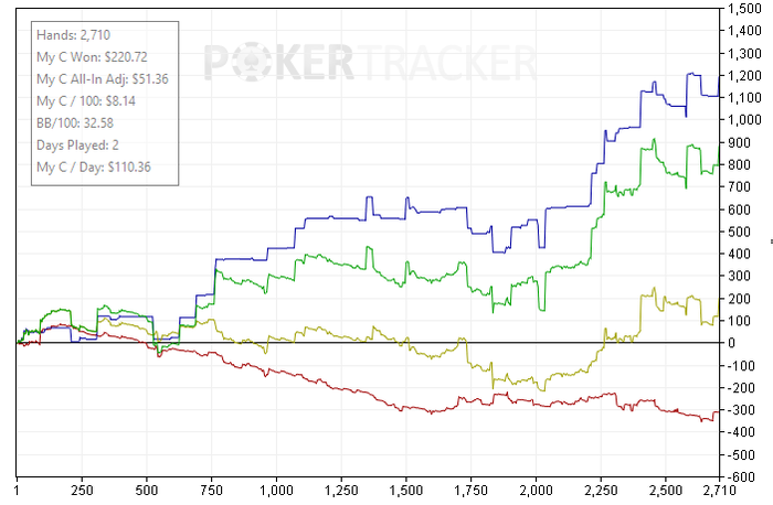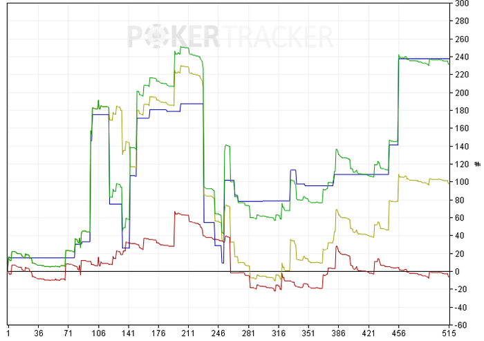 Пришлось затайтиться, не хватает скилла пока.... Ну как минимум абц покер в небольшой плюс катать могу. Там где красная шла вниз - 4 стола зума, как выровнялась - три стола. Насколько я понимаю - у меня масса оверфолдов по всем улицам. Буду работать. Смотрю свои сессии пост фактум и думаю, вот какого хрена ты тут скинул?
