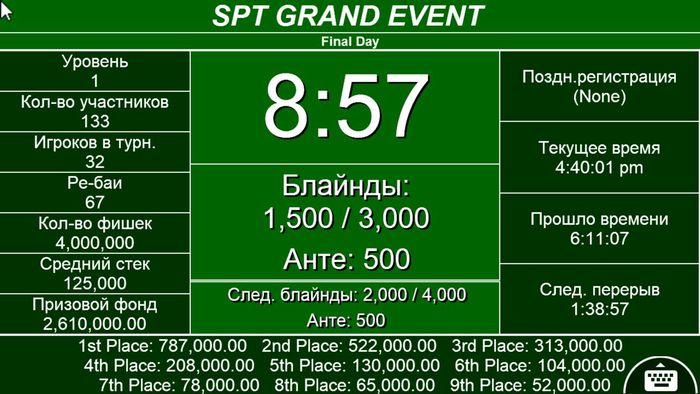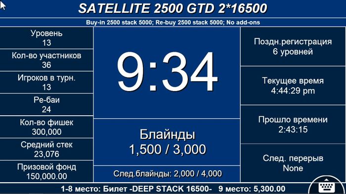 Добрый день! Расписание сегодняшнего дня: 14:00 turbo satellite to Deep Stack по 2500 гарантия 2 билета 15:00 финал Grand Event 18:00 Deep Stack формат RE-ENTRY вход 16.500 гарантия 750.000