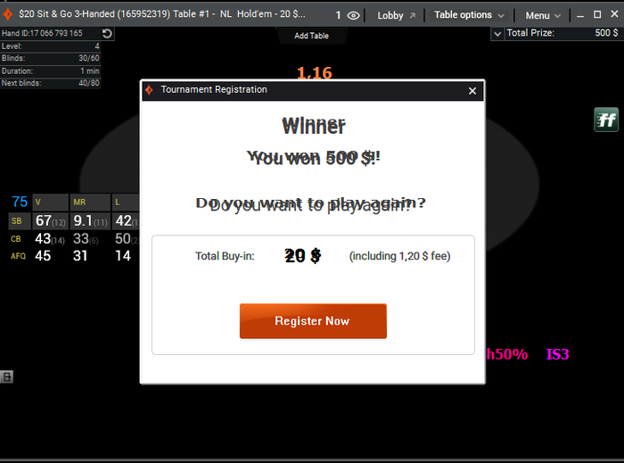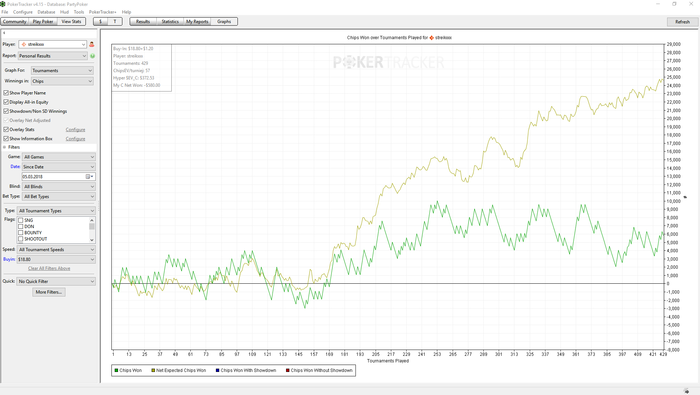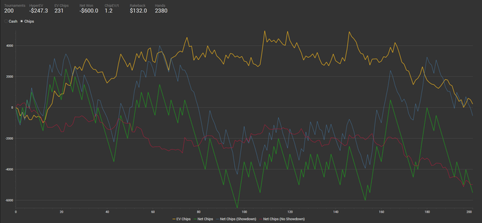 Aleks1989, ты меня не понял. Я говорил что на 1000 турниров преимущественно 20 лимита рб в 600 юсд это то на что стоит обратить внимание. Но после твоего уточнения я посмотрел на количество рук, да 4.4 руки за турнир маловато. Но я на это изначально даже не обратил внимания)))