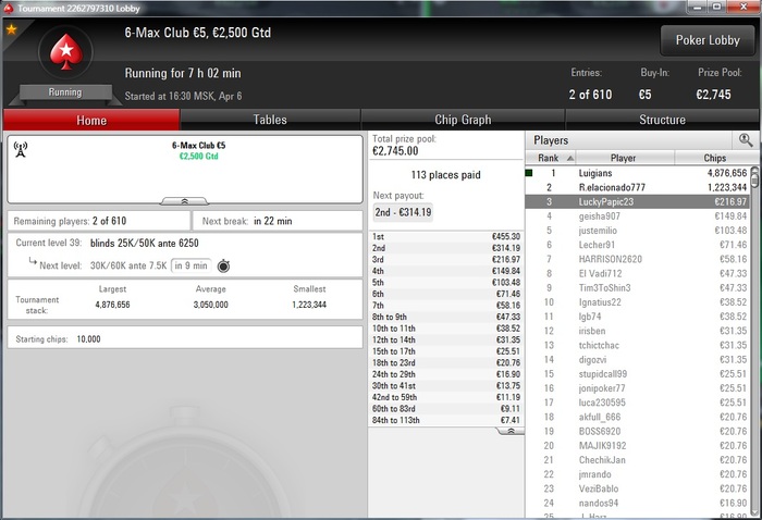 Итого отыграно турниров:14 в ITM:3 Общий байин:260 евро Общие призовые:465.94 евро Профит:+205.94 евро