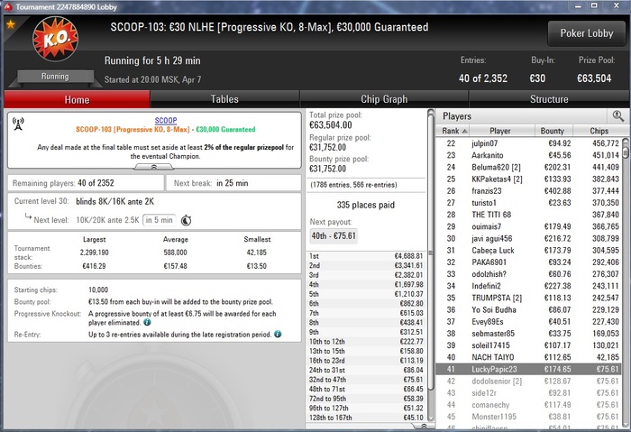 Составил турнирные сетки на предстоящие онлайн серии. С 29-го апреля по 21 мая получится марафончик с турнирами каждый день. Катушка будет знатная! Нагрузку в последнее время сбавил и попробовал пока поиграть сатилиты на Пати всякие разные, чтобы прощупать почву. В Сочи отбор пока без результата. Время ещё есть, может и получится отбор пройти. Удалось урвать зато билетик на 109$, через халявные 11$ которые насыпают каждый день. Решил, что попробую сыграть Баунти-Хантер за 109. Со следующей недели начну подготовку к сериям уже в рабочем режиме.