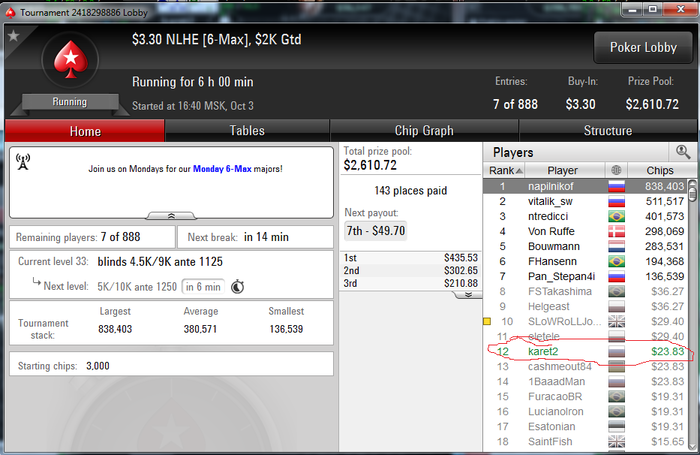 Так что наращивание банкролла продолжается. Но после того провала, я для себя сделал некоторые выводы и решил: НЕ ИГРАТЬ ТУРБО ТУРНИРЫ во всяком случае - пока. Уж, очень они дисперсионные.