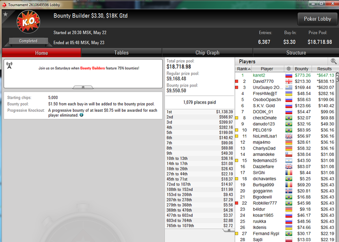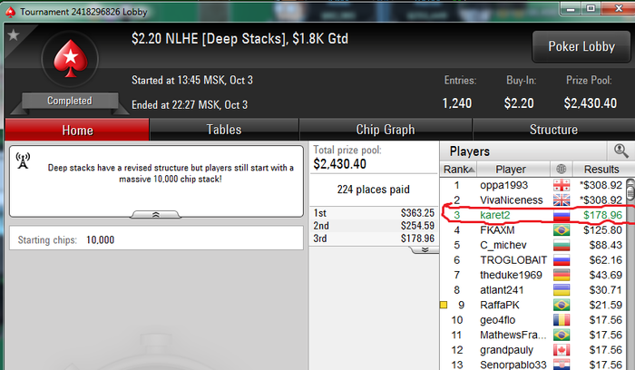 За то время что я не писАл тут, происходило следующее: На основном PokerStars я успел залить все те деньги что были в кассе (108$); но т.к. депозит вносить не хотелось, я решил расчехлить имеющиеся у меня сундуки купил несколько билетов на турниры и в турнире за 2,20$ дошёл до финалки и получил 62$. Скрин я не сделал потому что вылетел как-то обидно и выключил комп нахрен, а в pokerprolabs найти эту строку не могу. Были и другие глубокие проходы и ещё финалка: