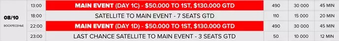13.00 - $490 MAIN EVENT (DAY 1B) $50,000 TO 1ST, $130,000 GTD 18.00 - $110 SATELLITE TO MAIN EVENT - 7 SEATS GTD 22:00 - $490 MAIN EVENT (DAY 1C) $50,000 TO 1ST, $130,000 GTD 23:00 - $50 LAST CHANCE SATELLITE TO MAIN EVENT - 3 SEATS GTD