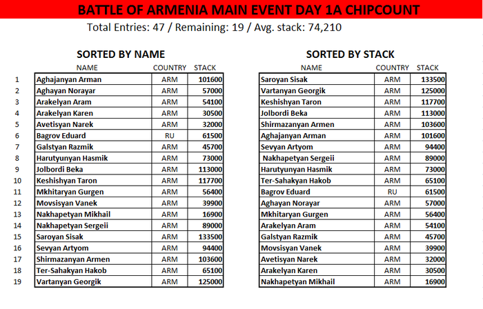 Последний уровень первого дня 1A Главного События Battle of Armenia доигран и в нём осталось 19 участников, которые вернутся в игру 9 октября в 15:00. Сейчас ребятам помогают упаковать фишки и подписать пакеты. Поздравляем всех выживших, так держать