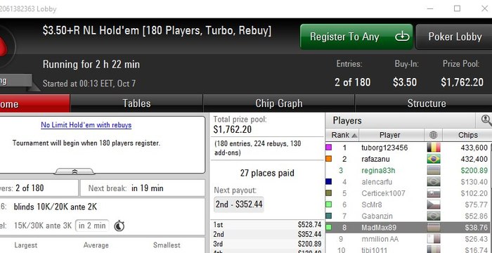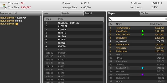 Второе место, шел первым до топ 8 , потом 7 с 8 после сомнительного выставления АК в АА. Дальше моя очередь АА в АД. Когда оставались втроем у нас КК батон пушит 20 бб 77, СБ пушит 50бб с АД у нас на ББ КК и тоже 50 бб, флоп не наш и мы по счастливому итогу на Втором!