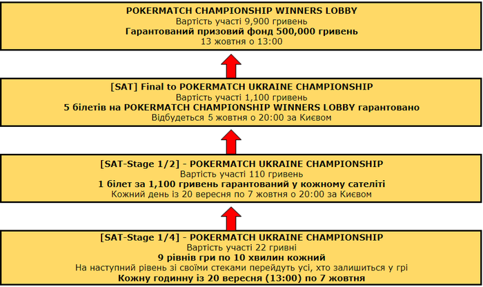 Друзья, напоминаем! Сегодня, 5 октября, на PokerMatch пройдет онлайн-саттелит на турнир PokerMatch Ukraine Championship (состоится на серии PokerMatch UA Millions в Харькове 13 октября). Байин - 1100 грн. Гарантия - 5 путевок на чемпионат! Начало в 20:00.