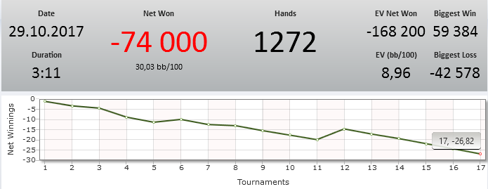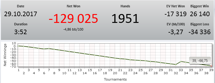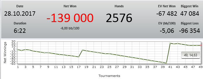 Поиграл в холдем. Сессию оттыграл хорошо. Ошибок явных прям не было. Вытащил сессию последний турик где слил ху за 40 баксов((( Я там ничего поделать не мог. К таким сессия отношусь как к должному. Ждем завтра)