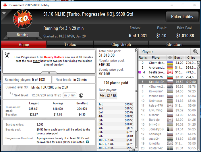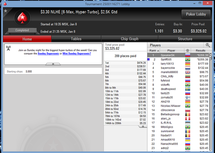 На финалку вышел с 5бб. Дошел до топ2, соотношение стеков было 1 к 6 в пользу оппа, удалось через 20 минут набрать, но АК проигарли выставление АJ. В итоге ХА проигран, а баунти там были просто охрененные, ппц расстроился(