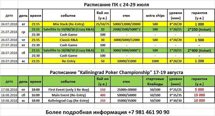 19.08.18 в 18:00 турнир "Kaliningrad Cup (Re-entry)" по 12500р. Гарантия 500.000 рублей.