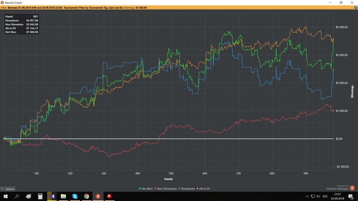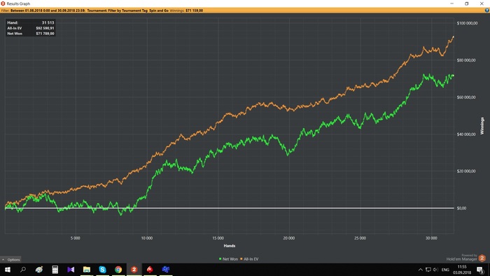 Всем привет! Нет нет покер не забросил. Работаю над игрой, правда немного меньше уделяю времени, так как болезнь и лето. Обучение проходит в штатном режиме. Хотелось бы отметить, что только в последнее время обучение позволило собрать стратегию в более менее целостную картину, и как мне кажется начинает по хорошему приносить свои плоды. Скажите большой период, верно, но когда ты полностью меняешь свои игру под другой стиль, под другую дисциплину, да все основы, то очень сложно все перестроить без потери. Надеюсь что этот долгий период закончен и начинается новая строка. Спросите про лимиты, с апреля добрался с 0.25 до 5 лимита. Графики не буду показывать так как, было много качель и огромнейшая недодача. В ближайшее время надеюсь на переход на лимит выше, так как чувствую в себе силы и уверенность, благодаря обучению. Много работал над диапазонами, над защитой и т.д., удалось значительно улучшить показатели по позициям и в ха и в 3 макс. В заключении за весенне летний период сыграно более 12 тыс туров, топ джеков так и не видел, в обще хочу сказать что совсем мало выпадает и х10 и х25, конечно статистику не веду, но не выпадают, даже и не вспомню когда был последний хороший множитель.