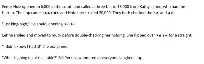 пару раздач с участием Кэтти, в одной из них она выбила Дага Полка, а во второй поставила 3бет и цбет по флопу против Феди Хольца, прочекав тёрн и ривер, хотела уже выкинуть карты, но неожиданно обнаружила стрит.