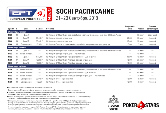 Важно заметить, что игроки, оплатившие бай-ин напрямую, лишены права участвовать в розыгрыше Last Longer Platinum Pass, в отличие от тех, кто прошел квалификацию. Мы понимаем, что у каждого из сателлитчиков по отдельности шанс на выигрыш небольшой, но он есть, и каждый претендует на пакет стоимостью $30 000 до того момента, пока играет в Главном Событии. Изначально данной акции не было, и она была введена специально для того, чтобы показать наше особое отношение к игрокам, которые отбираются через сателлиты. Надеемся, что это как-то сгладит ситуацию с обменным курсом, возникшую не по нашей вине."