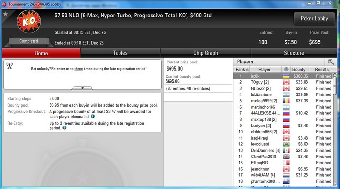 Был перерыв 3 дня, сегодня играл всю сессию без музыки, с хорошей концентрацией, в пике доходило до 9-10 столов хотя стабильно играю максимум 6-7. Даже жесткачи ни капли не загнали в тильт. Сыграл 37 турниров(12 из них саты), отобрался на: биг16,5 биг22 ВВ22 дейли марафон55. задипранил биг22(2 раза) и ВВ4.40, в дипранах капец как нескладывалось. Сессия в +75