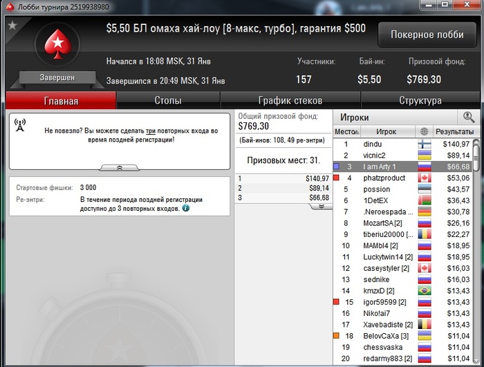 Всего 1 итм в 10 турнирах, на предфиналке вылетел КО куршевеля, сейчас оставался последний ребайник, в котором вылетел почти бабблбоем, был проходной стэк, но запихнул премиум руку в четверых с такими же стэками, вколлили на А227, у меня было 60% и я вылетел, ну не ошибся, не запихнуть 15 бб (А4)(К4) нереально в этой ситуации, когда 47 человек в итм и средние стэки стараются не рисковать, на баббле ребайников вылетать всегда болезненно, как никак итм это 6 би, учитывая мое отсутствие ребаев и аддона, больно конечно так вылетать, когда вся воскресная сессия ушла в никуда, хотел ведь не играть сегодня, в подавленном настроении находился весь день из-за личных причин, но ведь как не играть воскресенье, самый выгодный день недели, но по факту третий день подряд в минус, в снг один единственный итм из 15 сыгранных, про Party молчу, там 5 туриков без итм, разменяли вторые 100$ депозита.