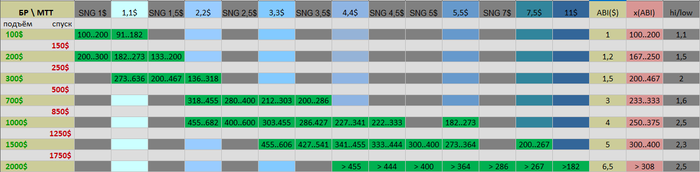 Все цели выполнены! Профит положительный. На этой неделе сыграл 5 сессий (понедельник-пятница), работал с программой "SNG-Wizard". Сейчас осваиваю ICM финального стола на основе СНГ 45-макс. Также поработал над составлением нового банкроллменеджмента. После перенесённого даунстрика в МТТ напрочь отпало желание использовать всякие там выстрелы, агрессивный БРМ ,сателлиты и прочее зло. Теперь буду управлять игровым капиталом только консервативными методами. Не стал составлять сразу до АБИ=5000$... Итак, прошу представить - мой новый банкроллменеджмент для Марафона МТСНГ: цели на неделю(18-24 ноября) :