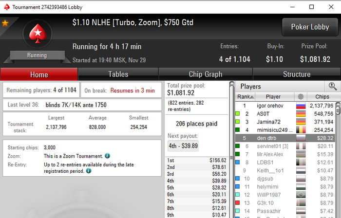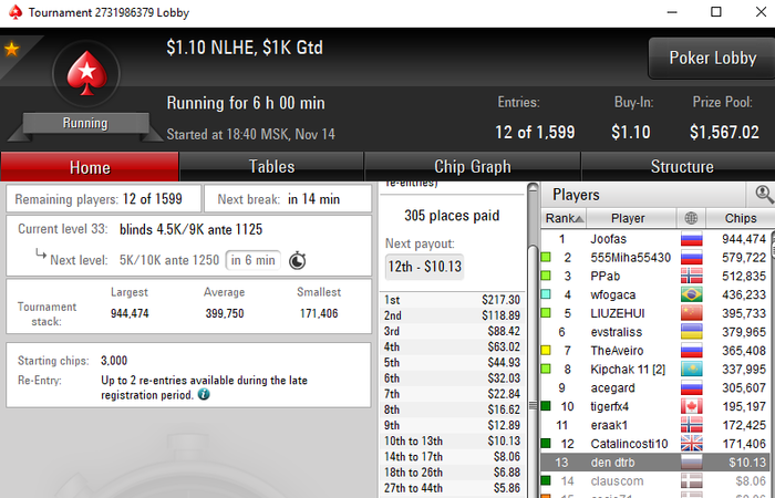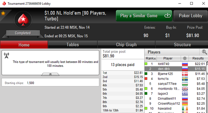 Все цели выполнены! Вчера была финалка в турнире: 1,10$ [Zoom; turbo]. Как известно из предыдущего поста, сложилась она не очень Вылет с финалки В итоге - 5 место. Немного тильтанул, конечно. Но ничего страшного - бывает. Нужно больше финалок и "первое" не за горами. Сегодня получил "компенсацию" за переезд в виде апчика. В итоге получилась лучшая сессия за месяц:
