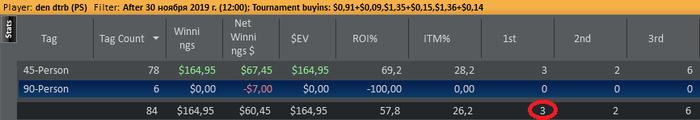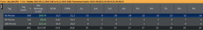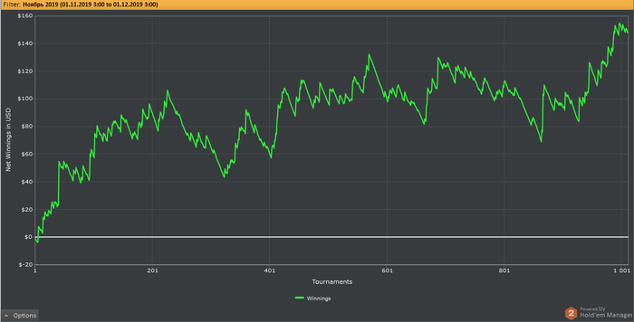 Все цели выполнены! По профиту неделя околонулевая(плюсанул всего несколько баксов), но тем не менее, понемногу карабкаемся вверх В ноябре, чтобы набить минимальную дистанцию, остаётся сыграть 212 турниров. План на эту неделю - 3 сессии по 70..75 турниров(ср, чт, пт). МТТ скорее всего подгружать не буду. Добью лучше чисто 45-максами. Работе над игрой уделил запланированные 10 часов. Продолжаю изучать ICM финального стола и уже нашёл кучу ликов, которые последовательно разбираю и пытаюсь устранять. Недавно наткнулся на давно забытую функцию ХМ2 - "Marked hands". Оказалось - крутая штука. И теперь взял за правило, прямо во время сессии, отмечать спорные раздачи, для последующего разбора.(может, для большинства регуляров, это обычная практика, но для меня это ноу-хау)
