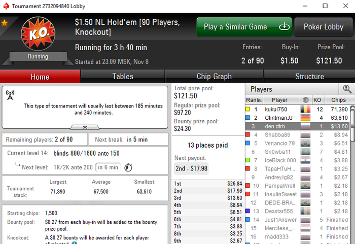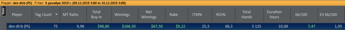 День 1 Турниров: 0 + 75 = 75/500 (15%) (+15%) Профит: 0$ + 69$ = 69$ (+69$)(рейкбек = 1,5$) В первый день настиг переап. Оформил "бэст дэй" = +69$(после 1 ноября 2019) Получилось две сессии - 15...20 часов и 23..2 часа по МСК. В конце первой сессии были одни финалки. Давно так не насыпало.