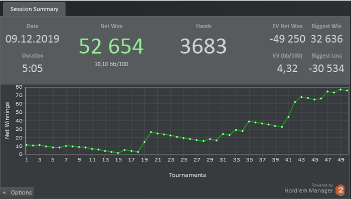 По дистанции, на этой неделе, отстаю от графика. С понедельника начал переход на другой суточный распорядок. Причина перехода в том, что начал ложиться спать почти в полдень и спать до 8-ми часов вечера(до этого ложился в 4 утра, а просыпался в обед, но постепенно начал ложиться всё позже и позже, и так "докатился" до полудня). Возможно и не самый плохой распорядок для покериста, но социальную жизнь тоже надо как-то поддерживать(всё-таки, я - человек общительный, и круглосуточное залипание в один только монитор, пусть даже при занятии любимым делом, сильно меня угнетает). Установил новый, оптимальный для себя режим сна: отбой - 2:00 ; подъём - 10:00. Для перехода решил перетерпеть с полудня до вечера(пропустить один суточный ритм) В итоге начал просыпаться в два часа ночи. Как результат, словил жёсткий джетлаг, со всеми его ярко-выраженными симптомами, и до четверга чувствовал себя как-будто не спал вообще трое суток. В среду вечером, запустил сессию и понял, что просто не могу играть, в связи с чем, катка была приостановлена. В результате сыграл всего 19 турниров. В пятницу тоже катал как зомби. С выходных уже чувствую себя более-менее. На этой неделе, постараюсь окончательно закрепить свой режим сна и начать ложиться/вставать в одно время.