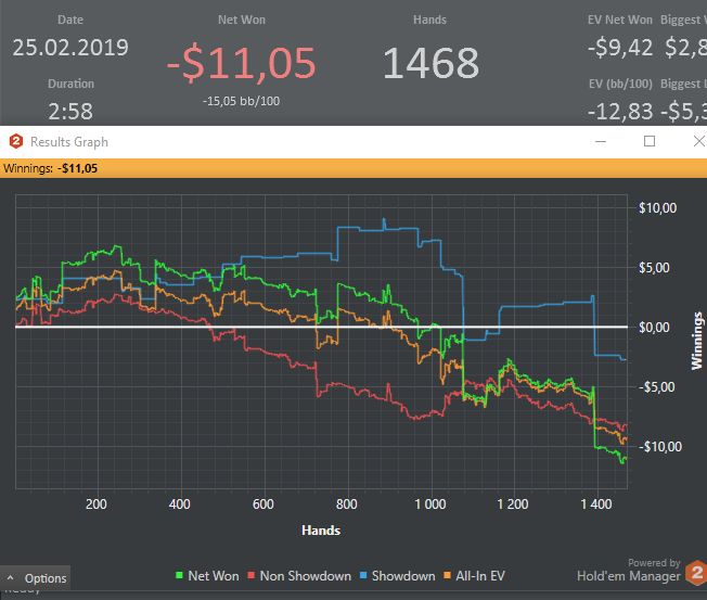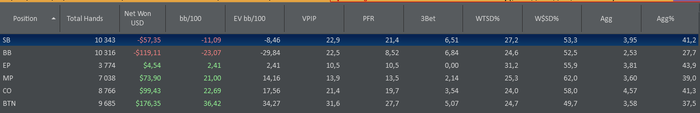 SB: $6.66 (133.2 bb)Hero (BB): $10.85 (217 bb)MP: $7.72 (154.4 bb)