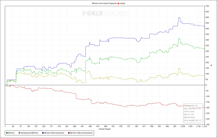 UTG+1: 17.76 BB (VPIP: 18.64, PFR: 16.22, 3Bet Preflop: 10.87, Hands: 119)