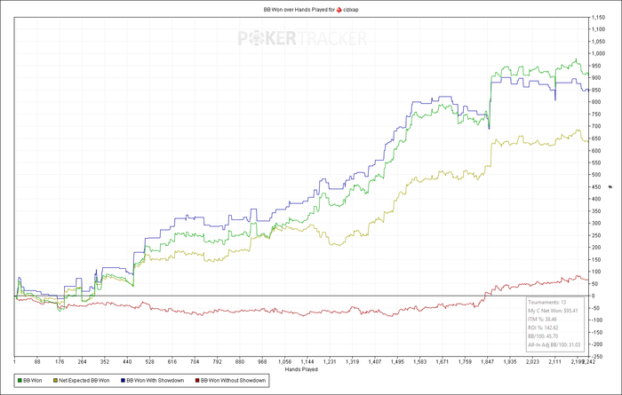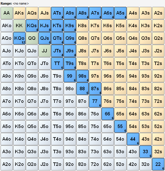MP+1: 32.54 BB (VPIP: 15.95, PFR: 12.84, 3Bet Preflop: 6.62, Hands: 12,141)