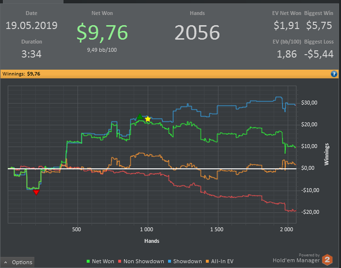 В общем закончил дневную сессию, ну наконец-то график пополз вверх, а что я особенного делал, да вроде ничего не считая, пару херофолдов, в сомнительной ситуации, снизу приложу раздачи. Ну и жестко селектил столы, чтобы хотя бы 1 фиш был, и это работает отлично ) +30$ это не хухры мухры =)