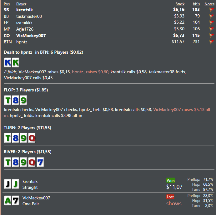 тут я прикинул, что как бы доска вроде и неплохая, но в тоже время стрит/флешдро, и когда тип на КО от меня запушил я подумал что там либо сет либо флешдро, плюс за нами еще сидит регуляр, который не просто так наверно заколил трибет 4х сайза против фиша, ну и я решил сбросить, конечно если бы мы были бы с фишом 1 vs 1, там изи колл, и на дистанции плюсово, но рег все испортил )