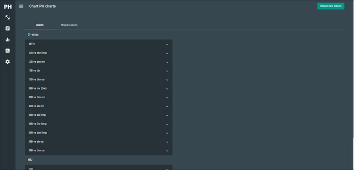Пак чартов состоит из уроков (Lessons) - конкретная ситуация, в которой находится игрок. Например, HU - BB - vs SB MR - vs fish. При создании нового урока (кнопка "Create new lesson" справа сверху) необходимо указать данные параметры.
