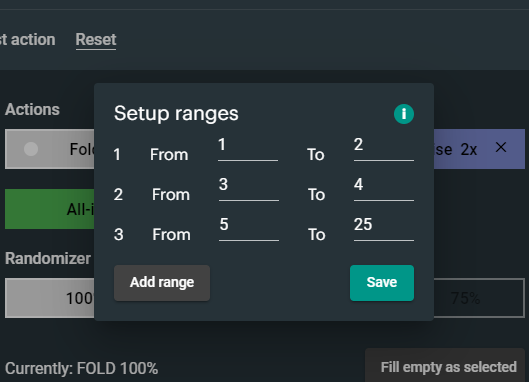 Fold unavailable - помечает все комбинации, которые не доступны во втором шаге, как fold. Например, если мы первым действием пушим AA, то ситуации vs 3bet и vs all-in для AA нужно пометить fold. Чтобы упростить ручную работу, можно нажать эту кнопку