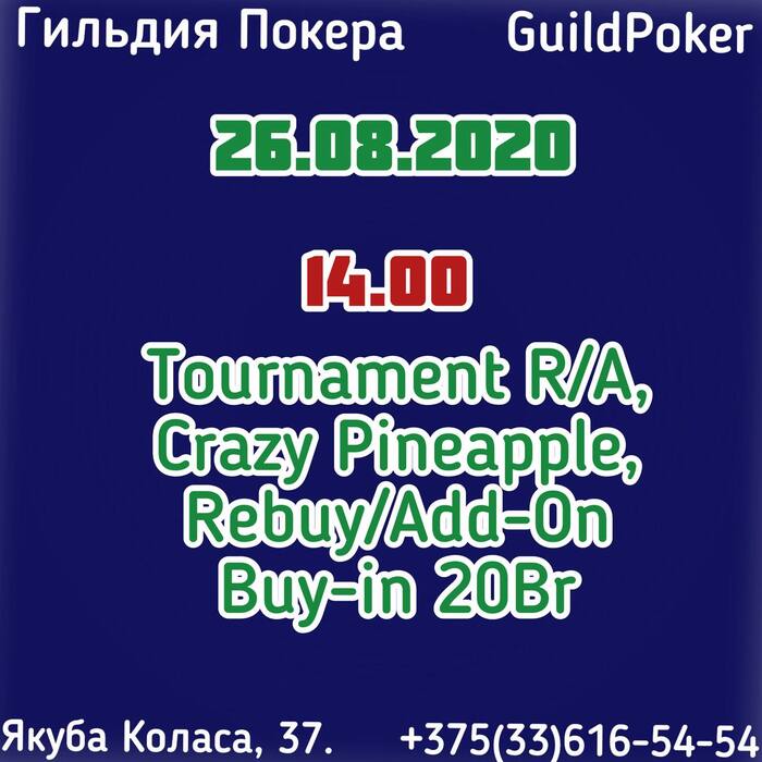 30.08.2020 ВОСКРЕСЕНЬЕ: 14-00 Tournament Chinese Pineapple Poker, Re-Entry турнир состоится, если будет предварительная регистрация до 29.08.2020/субботы 9 игроков Buy-in 50Br 17-00 FREEBUY SATELLITE TO CASH GAME, Hold'em, Rebuy/Add-On, гарантия 400Br