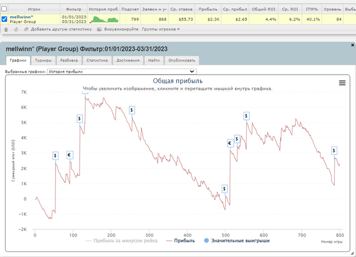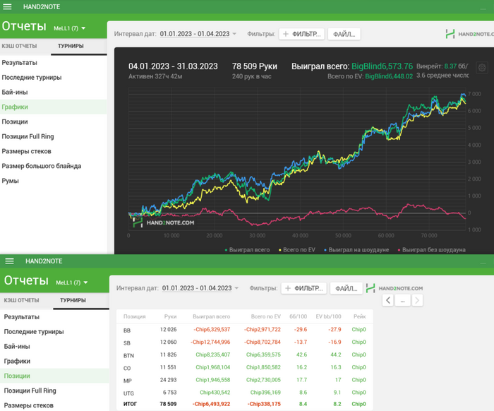 Друзья, привет всем! Кратко по итогам первого квартала. Наиграл наименьшую дистанцию за все время на таком промежутке времени в 3 месяца, примерно 870 турниров с учетом реентри. АБИ составил 62$. Денег, можно сказать, не выиграл, всего 2,3к с РОЕм 4,5%. То самое ощущение. когда тебе не доезжает как по деньгам, так и по раздачам, выставляешься либо снизу, либо сверху и проигрываешь, либо в начале турнира фишек нагреб, а в лейте все раздал. Винрейты 8,4 бб/100 и 8,2евбб/100.