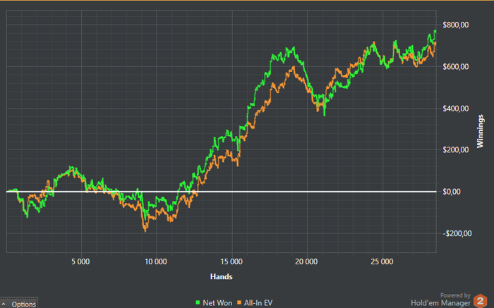 Пока сижу на нл25, игра идет комфортно, залил около 5-7 стеков в идиотских раздачах, но в остальном чувствую себя прекрасно. Когда увижу винрейт 9бб+ на дистанции 50к рук+, попробую шотнуть на полтиник, но точно не раньше апреля.