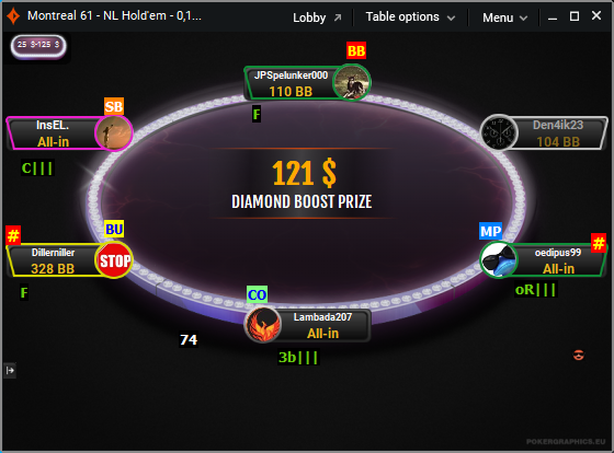 Это первый Diamond дроп который я видел. Зашла неплохая рука 43s, естественно это изи префлоп пуш. В итоге поехали в 3 человека: